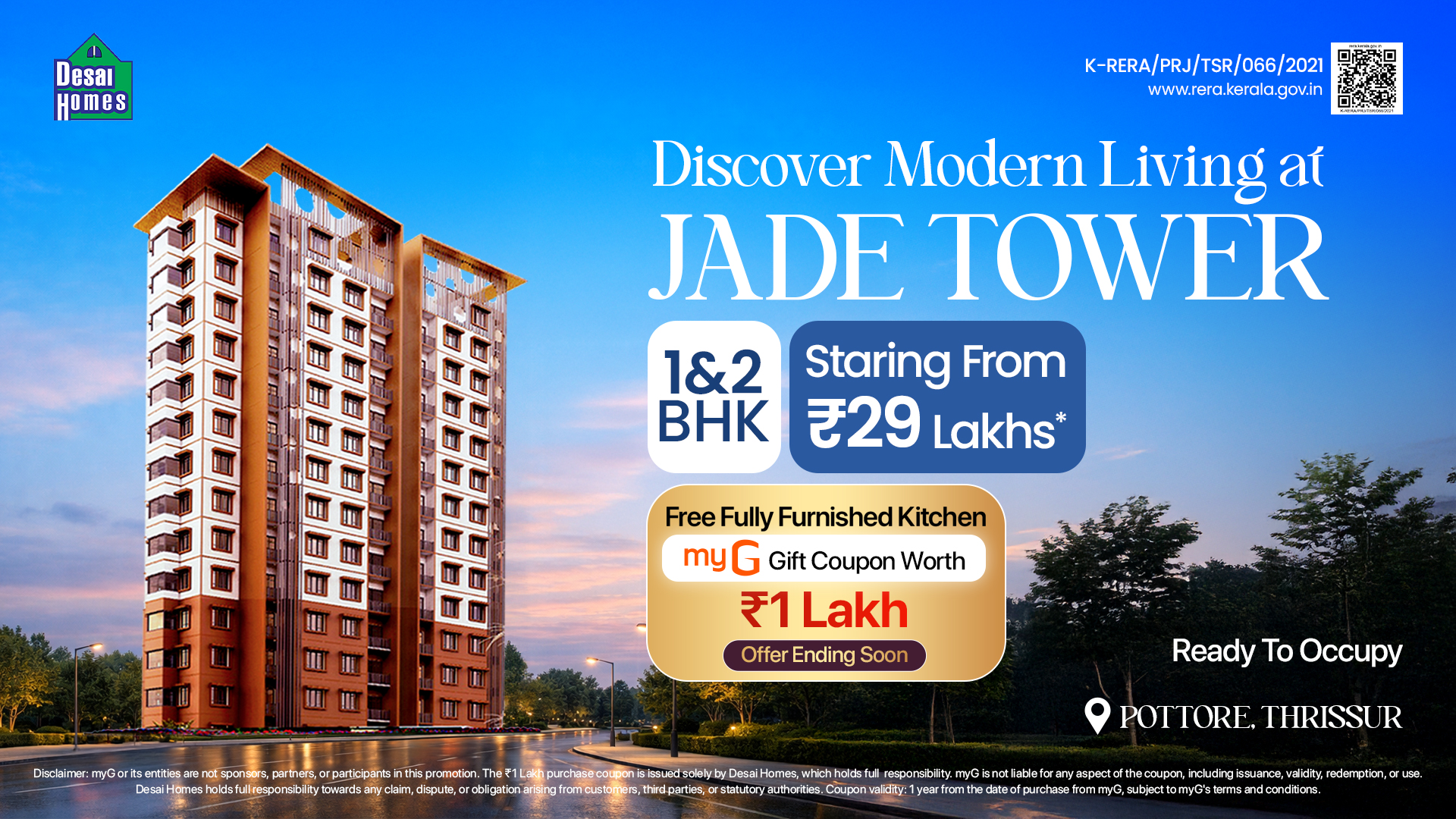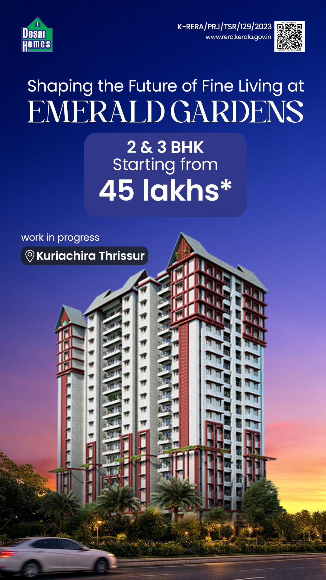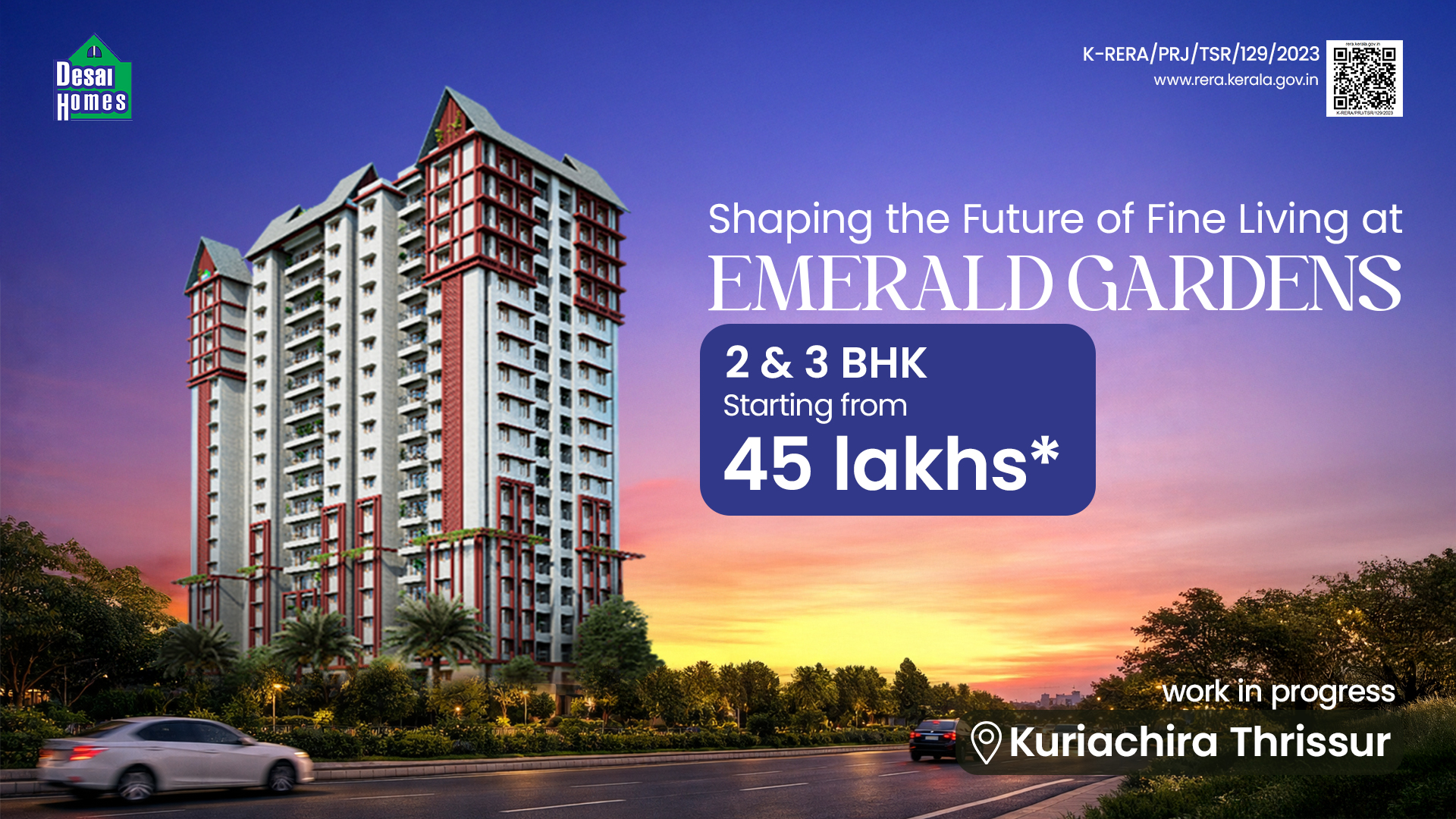 Desai Homes is your best option if you're looking to buy a flat in Thrissur Town. Because we built homes for people where they feel free to be who they are. We build apartments in Thrissur to cater to the preferences of all residents, creating a haven for each individual. At Desai Homes, we strive to meet the needs of every customer who comes to us. According to the client's requirements, we offer a diverse range of affordable and elite housing options like 1,2 & 3 BHK Flats in Thrissur, budget flats in Thrissur etc.